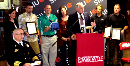 EDWARDSVILLE - October 16, 2007. Lt. Governor Pat Quinn saluted four people whose quick thinking saved a 32-year-old student’s life with an automated external defibrillator (AED). Quinn honored each of the Heartsavers at Southern Illinois University-Edwardsville with Heartsaver Hero awards.