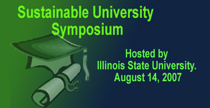 Second Annual Sustainable University Symposium. Hosted by Illinois State University. August 14, 2007 at the College of Business Building in Normal. For more information on this free event please visit www.GreenSolutions.il.gov or call 312-814-5220.