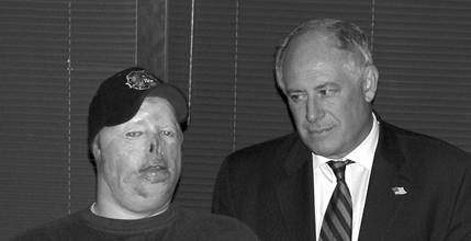 On Dec. 22, 2004, Lance Cpl. Ziegel was seriously wounded when a suicide bomber detonated a vehicle full of explosives. Ziegel’s wounds included third degree burns over his face, head and arms, a broken jaw and shrapnel to the brain. His left hand and three fingers on his right hand were amputated.